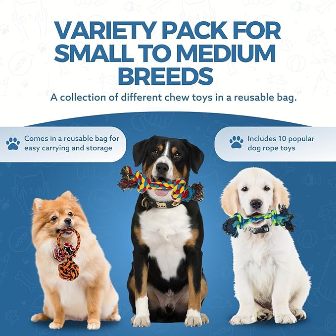 The Fur & Bone 10-Piece Dog Toy Set is a premium collection of heavy-duty rope chew toys specifically designed for medium and large breed dogs with strong chewing instincts. Crafted from tightly woven natural cotton fibers, this durable toy bundle delivers long-lasting performance, interactive engagement, and essential dental benefits.